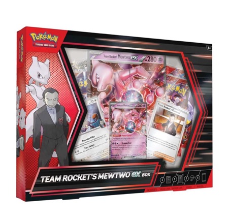 The Pokémon TCG: Team Rocket’s Mewtwo ex Box includes: